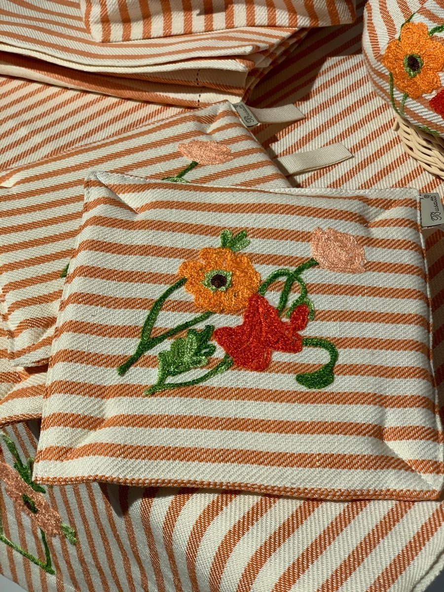 锅具隔热垫是每个厨房的必备品,而通过搭配刺绣装饰,使它变成了一件精美的工艺礼品!刺绣图案只出现在隔热垫的单面。