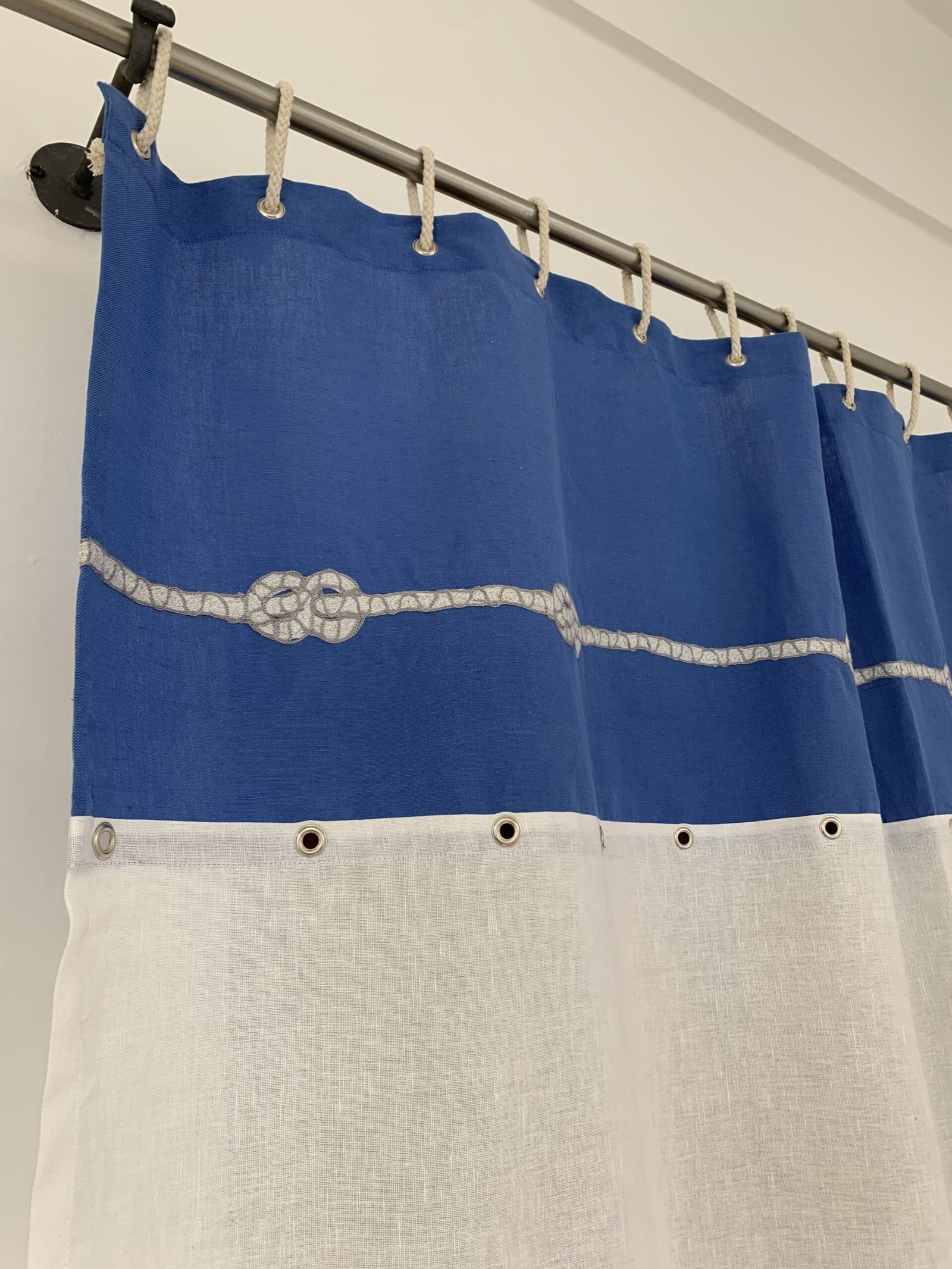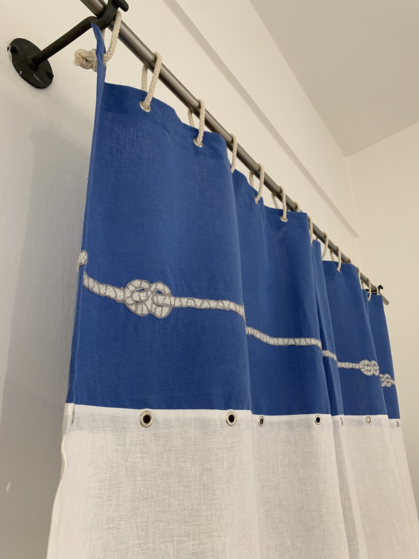 拉齐奥窗帘为哑光白,装饰有绳环;顶部衔接了浅蓝色的星辰织物180面料。