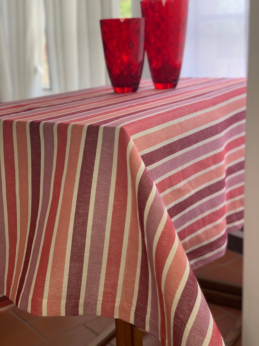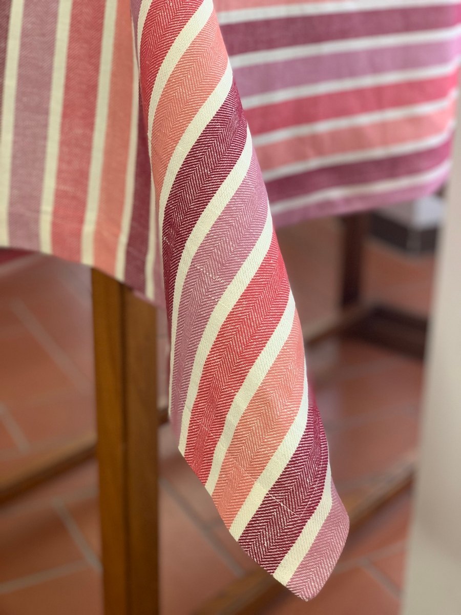 这款颜色条纹面料可以制成桌布、茶巾、餐垫、餐巾或任何你想到的布艺织物。它的质地紧实耐用,用途广泛,也可以成为你厨房中的好伴侣。紧密的织法使其在第一次清洗后变得愈发经久耐用。