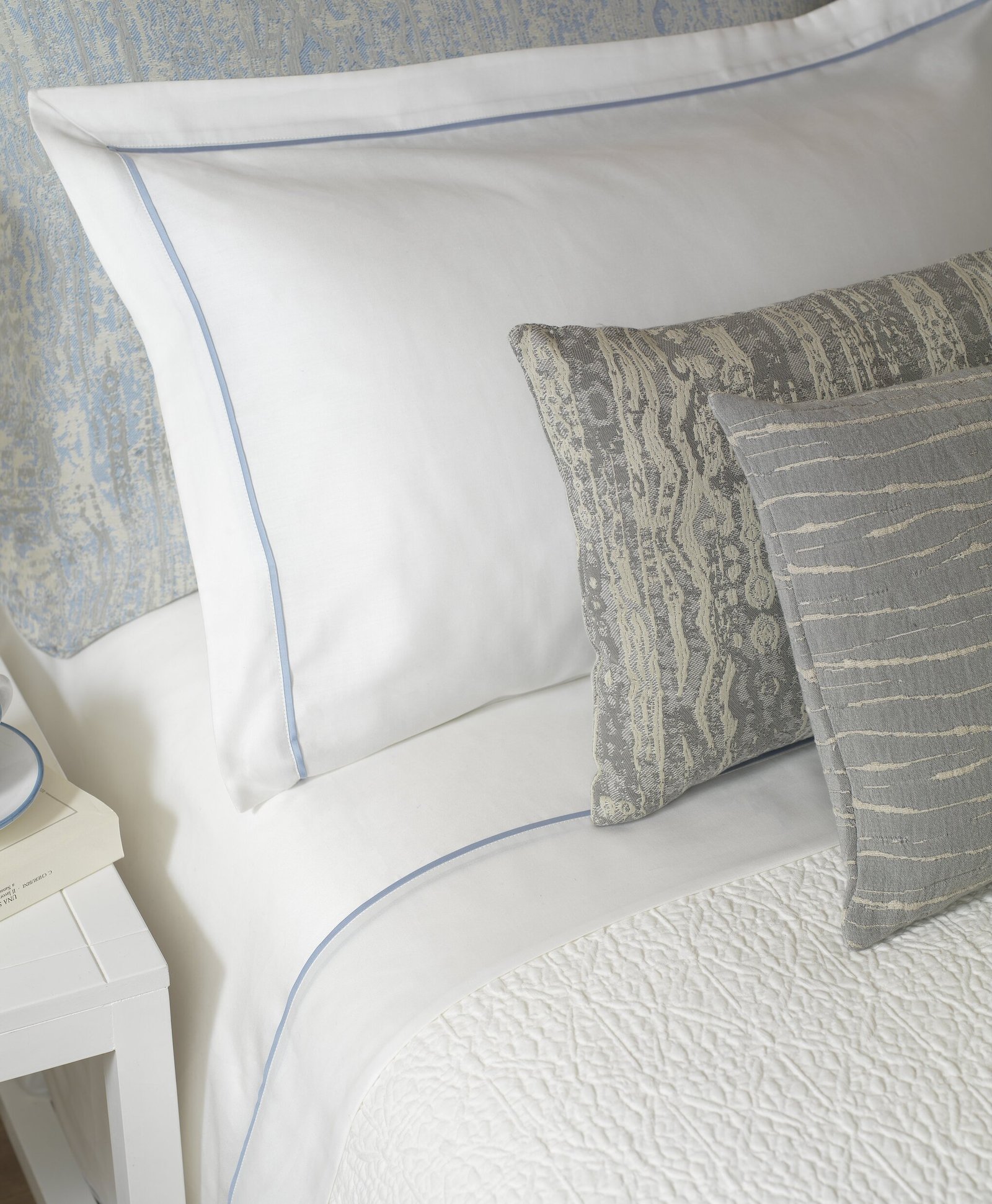 这款抱枕套使用三边鼠尾卷边的设计,带有些许小褶边。而底边则使用了弹性角设计。我们提供25厘米和30厘米两种尺寸。有同系列的卷边床单与抱枕搭配。